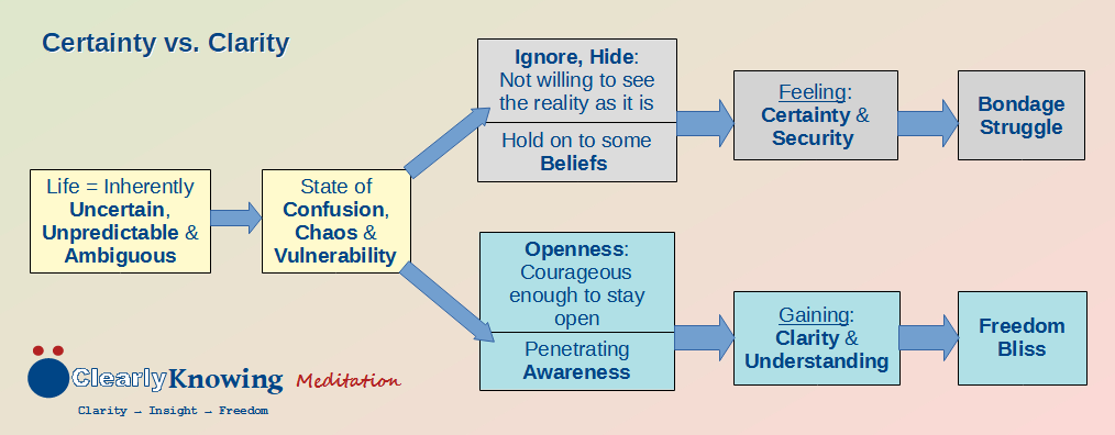 If we are courageous enough to stay open with that confusion and uncertainty with total awareness, it would naturally lead to clarity and understanding. Such an understanding and insight lead to true liberation. This is the process of mindfulness/meditation. In mindfulness/mediation (and also in science), we gain clarity and understanding, as oppose to absolute certainty. Only dogmatic beliefs give absolute certainty; with this false sense of certainty and security, people have inflicted so much of suffering to themselves and others.