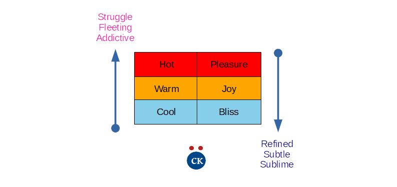 Hot-pleasure is highly fleeting, as it always has to come down from the build up, excited energy. Whereas cool-pleasure tends to grow deep steadily over time. Hot-pleasure is highly addictive, and it makes us slaves of craving without lasting satisfaction. Hot-pleasure is a coarse form of pleasure, while the cool-pleasure is highly refined, subtle and sublime. When we are heavily addicted to hot-pleasures, we lose the capacity to enjoy the subtle cool-pleasures.